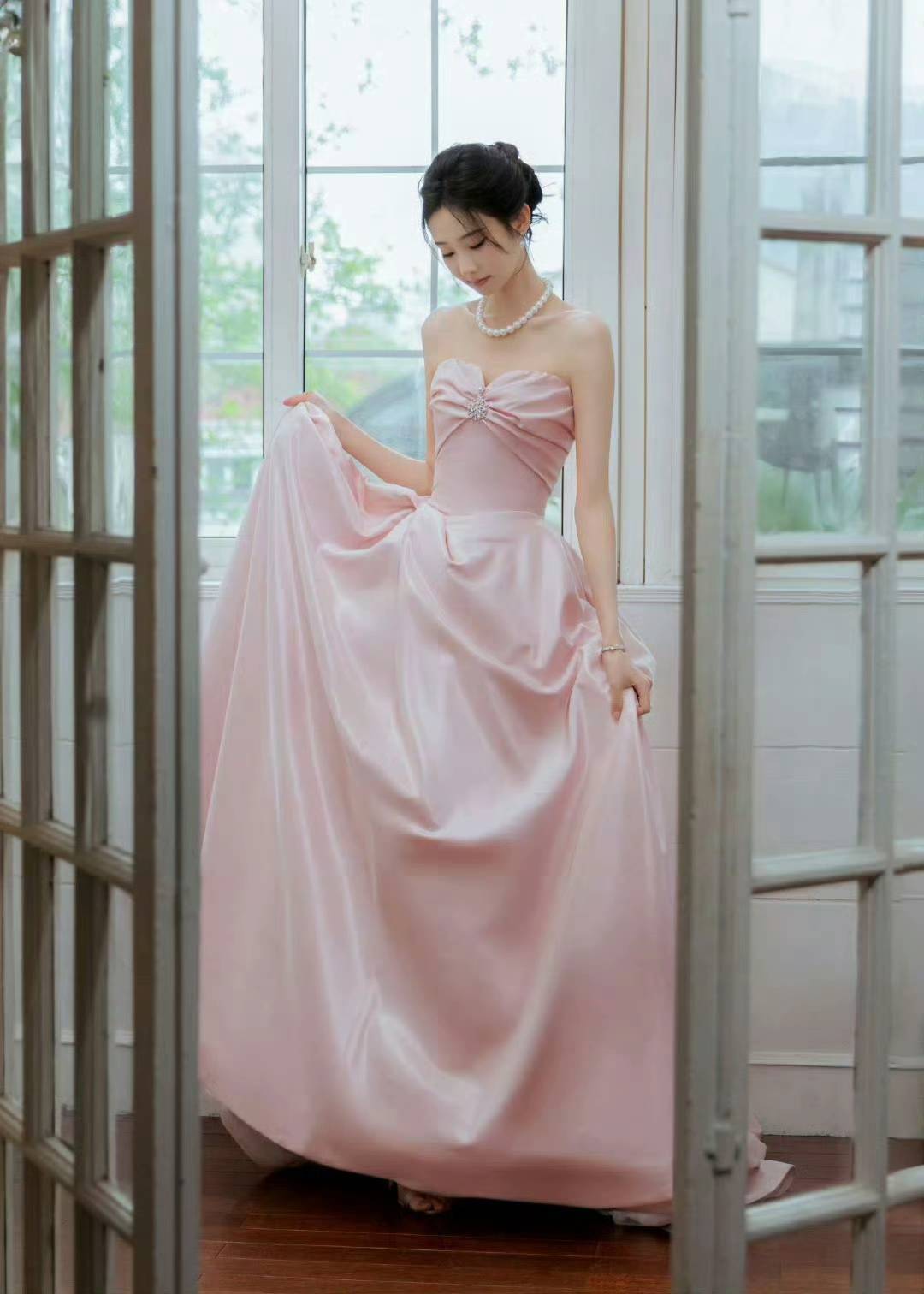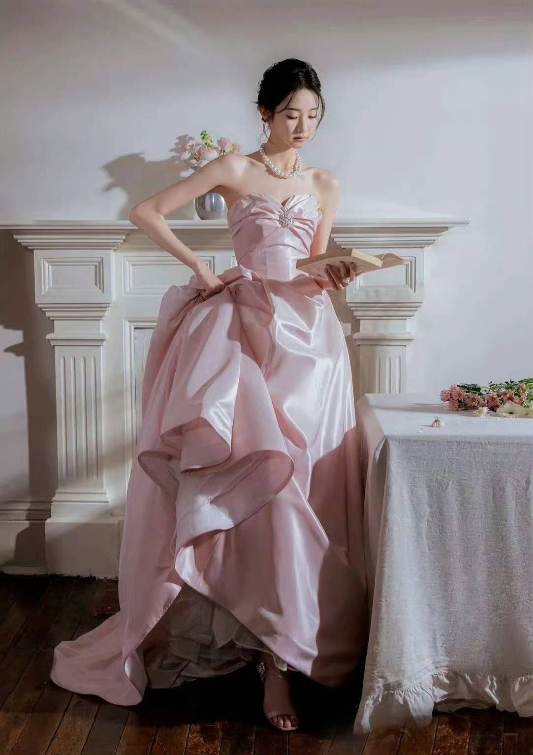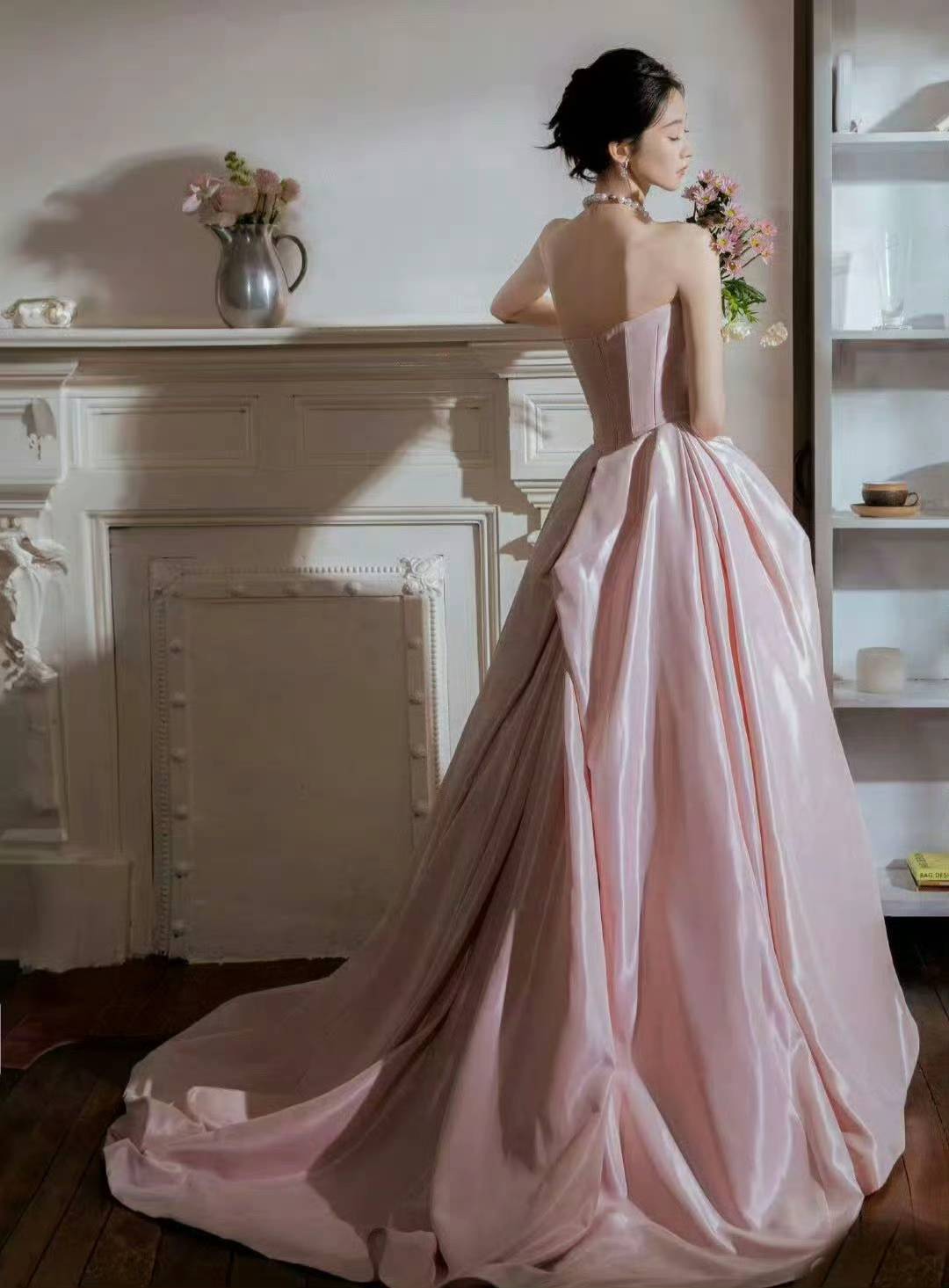 抹胸设计的柔粉色缎面礼裙,以立体褶皱与大裙摆营造浪漫氛围,珍珠配饰点缀其间,在复古壁炉与现代建筑的双重场景里,每一处细节都散发着优雅的高级感。