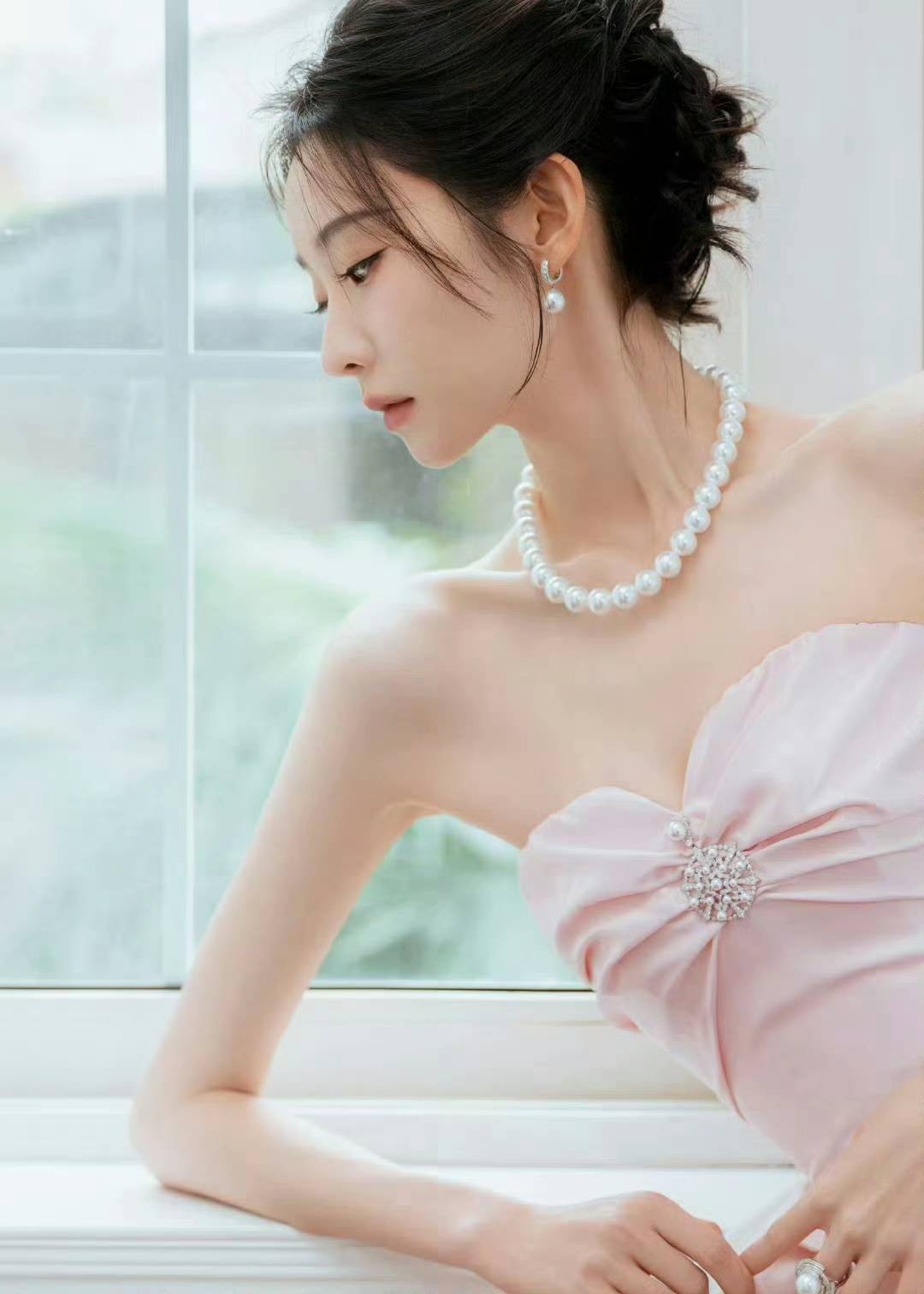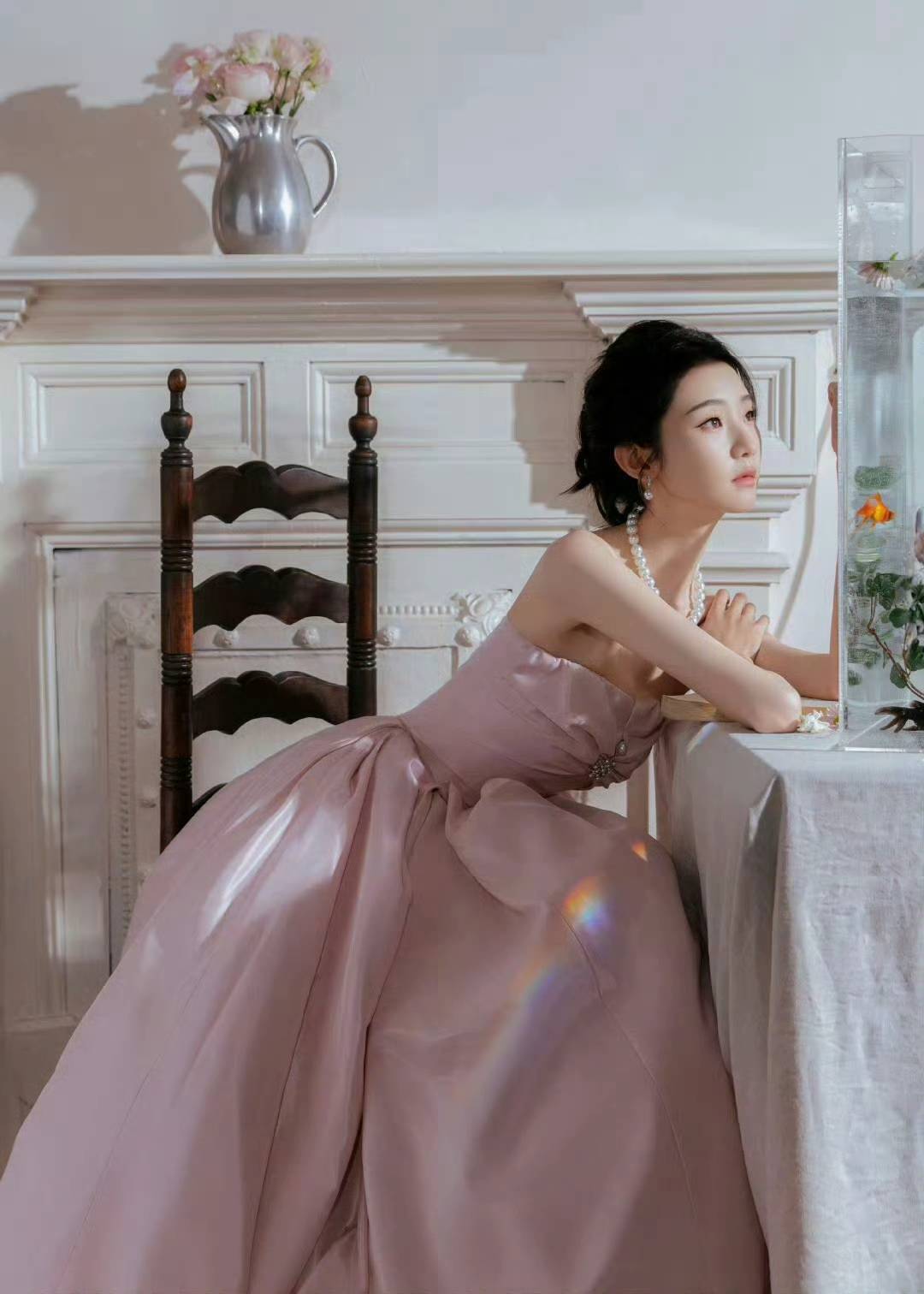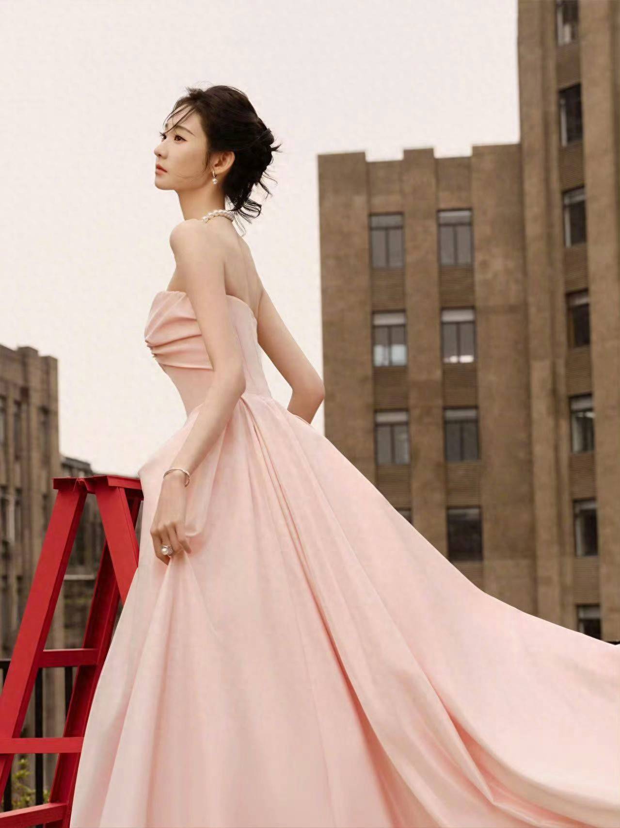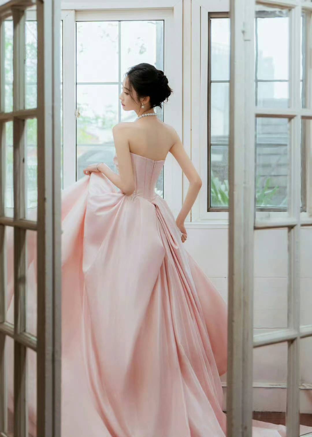 抹胸设计的柔粉色缎面礼裙,以立体褶皱与大裙摆营造浪漫氛围,珍珠配饰点缀其间,在复古壁炉与现代建筑的双重场景里,每一处细节都散发着优雅的高级感。